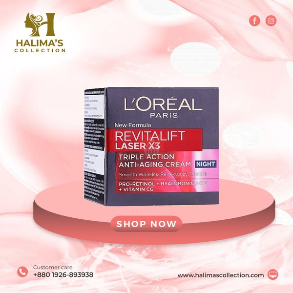 L’Oréal Paris Revitalift Laser X3 Day Cream is a powerful anti-ageing moisturiser with 3% Pro-Xylane™, Hyaluronic Acid, and Adenosine that hydrates, firms, and visibly reduces wrinkles for smoother, youthful-looking skin.